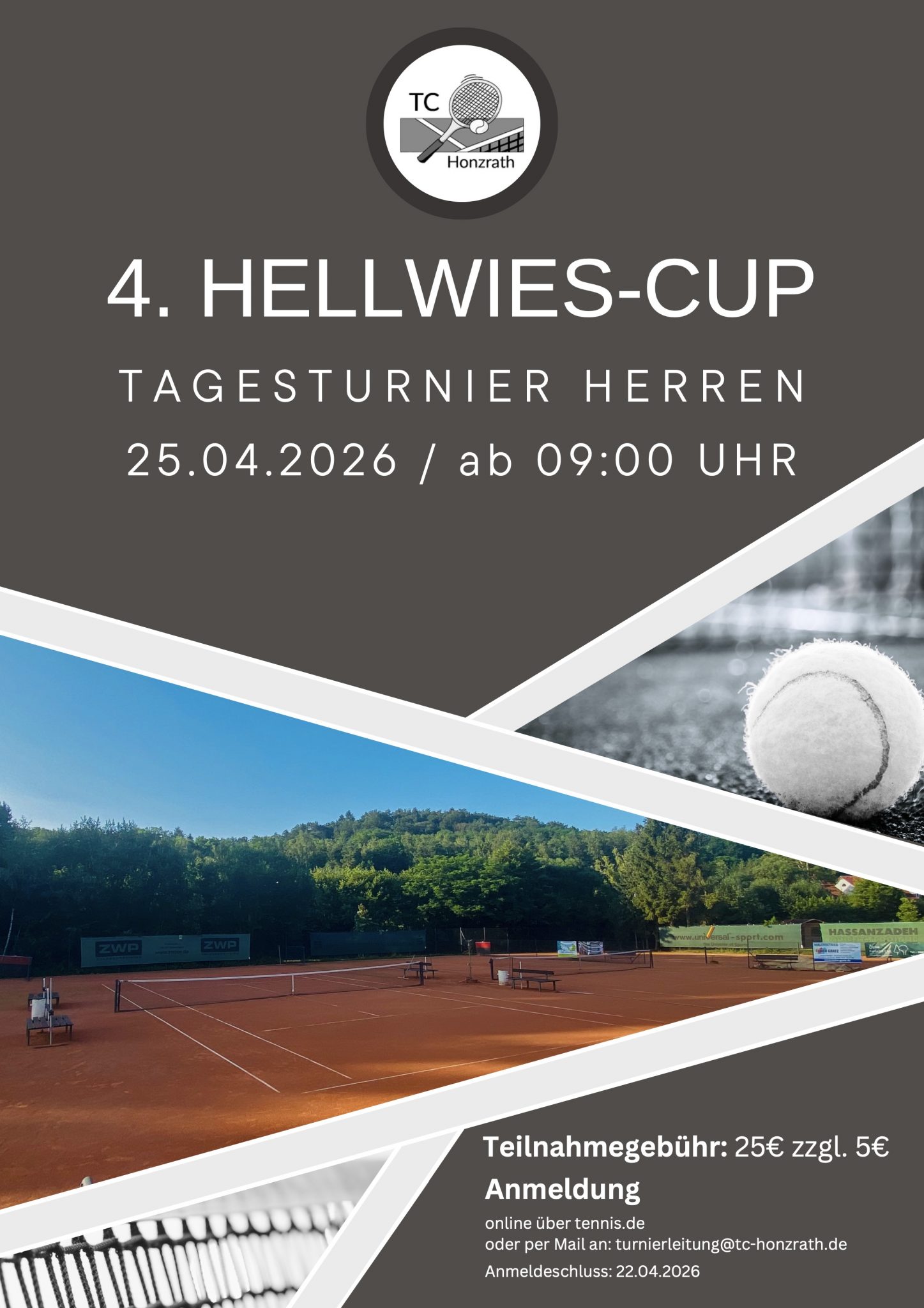 Am 25.04.2026 ab 09:00 Uhr findet der 4. Hellwies-Cup des TC Honzrath statt! Das Starterfeld umfasst 32 Spieler.